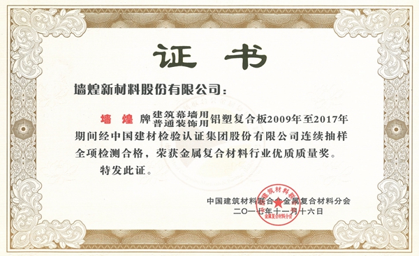 “墻煌”鋁塑板和鋁單板榮獲中國金屬復(fù)合材料行業(yè)“優(yōu)秀質(zhì)量獎(jiǎng)”和“優(yōu)質(zhì)工程應(yīng)用獎(jiǎng)” 2017年11月16日,“中國金屬復(fù)合材料行業(yè)...